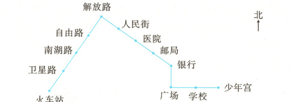1. 从火车站出发,先向( )方向行驶( )站到解放路,再向( )方向行驶( )站到银行,再向( )面行驶( )站到广场,最后向( )面行驶( )站到少年宫。(16分)