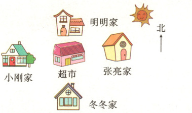 张亮家在超市的东面,小刚家在超市的( )面,明明家在超市的( )面,冬冬家在超市的( )面。