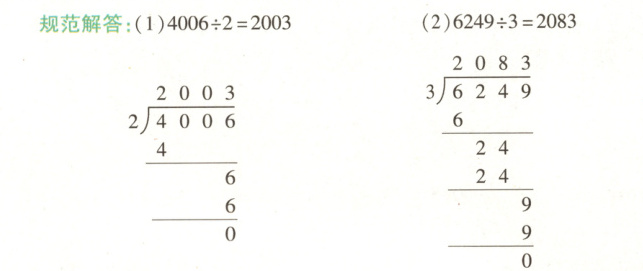 分析:计算商中间有0的多位数除以一位数,可以用计算商中间有0的三位数除以一位数的计算方法进行计算。注意不要忘记商0占位。