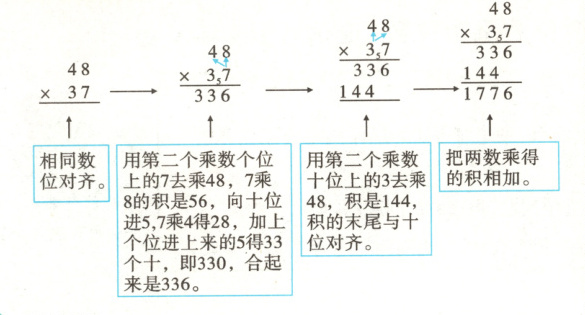 根据两位数乘一位数的笔算方法以及两位数乘两位数(不进位)的笔算方法,类推出两位数乘两位数(进位)的笔算方法: