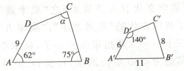 12. 如图,四边形$ABCD\backsim$四边形$A'B'C'D'$,且$\angle A = 62^{\circ}$,$\angle B = 75^{\circ}$,$\angle D' = 140^{\circ}$,$AD = 9$,$A'B' = 11$,$A'D' = 6$,$B'C' = 8$.