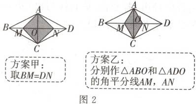 1. 如图1,在菱形ABCD中,对角线AC,BD相交于O,要在对角线BD上找两点M,N,使得四边形AMCN是菱形,现有图2中的甲、乙两种方案,则正确的方案是 ( )