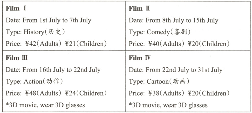 In July, there are some films on at Nanshan Coastal Cinema.[新趋势·多模态语篇]阅读表格,从每小题的三个选项中选出最佳选项。
