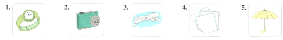 1. watch; mine 2. camera 3. plane 4. paper 5. umbrella