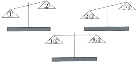 9.跨物理·天平 推理能力 梨花需要人工授粉才能提高产量,A、B、C、D四名同学利用周末帮助农民伯伯收集梨花花粉,他们收集的花粉质量分别记为①、②、③、④,农民伯伯家里没有精准的测量工具,四名同学就利用所学知识自制了没有砝码的简易天平(天平的误差忽略不计),测量过程如图所示: