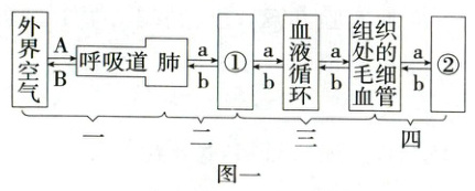 (1)图一中“一、二、三、四”分别表示呼吸过程的不同环节,其中“一”环节是通过__________实现的;“二”环节是通过____________________实现的。