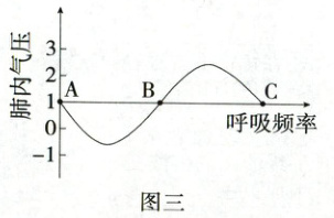 (4)图三中,曲线BC段与图二中的__________(填“甲”或“乙”)表示相同的呼吸状态;坐标中的__________点表示呼气结束的一瞬间,此时肺内气压__________外界气压。