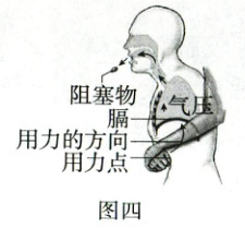(5)呼吸道阻塞会使气体无法进出肺,严重时可导致死亡,若呼吸道被异物阻塞,危急情况下可采用海姆立克急救法实施救助(如图四),其原理是________(填以下字母)。