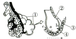 3.(2024山西高平多校三模)如图是肺泡和血液之间的气体交换示意图,①②③④代表结构,a、b代表气体,c、d代表该处的血液,虚线箭头代表血流方向。下列说法错误的是 ( )