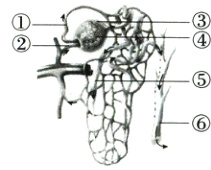 ①出球小动脉 ②入球小动脉 ③肾小囊 ④肾小球 ⑤肾小管 ⑥集合管