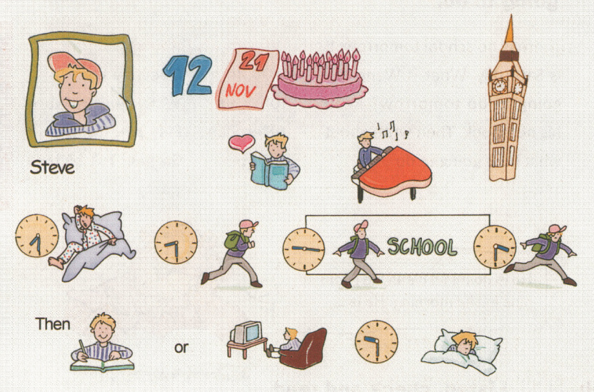 Steve gets up at ______________ in the morning. He goes to school at ______________. Classes begin at ______________.