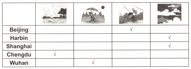II. Listen and tick.(听录音,根据你所听到的内容在每个城市对应的天气的方框内打“√”。)(10分)