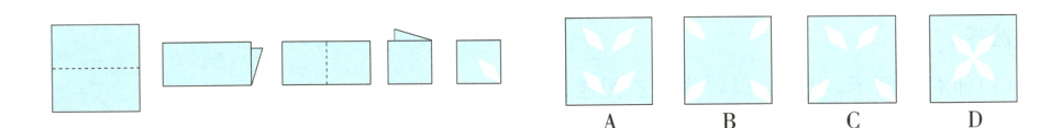 (1)将一张正方形纸对折两次,剪出如下图所示的小洞后展开,得到的图形是( )。