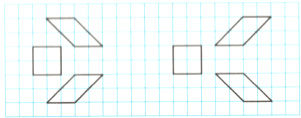 (1)把左、右两边的平行四边形分别向右、向左平移10格,涂上绿色;把正方形分别向右平移3格,涂上紫色。
