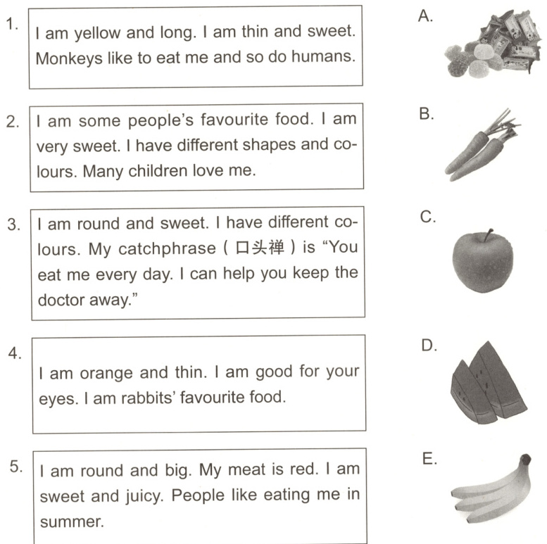 IV. Read and match.(读句子,猜一猜所描述的食物,并连线。)(10分)