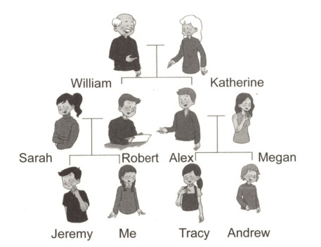 There are 1. ________ people in my family. Jeremy is my 2. ________. Tracy and Andrew are my 3. ________. I like playing with them. Sarah is my 4. ________. She is a teacher. Alex and Robert are 5. ________. Alex is my 6. ________. He is a driver. Tracy and Andrew's mother is my 7. ________. She is a nurse. William is my 8. ________. He is Robert and Alex's 9. ________. Katherine is my 10. ________. She likes reading newspapers.