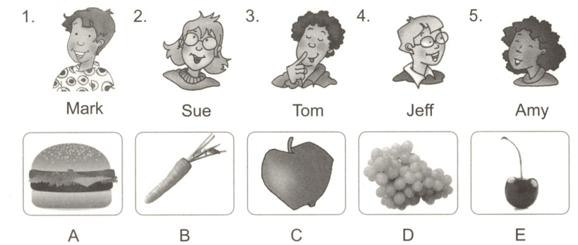 II. Listen and match.(听录音,判断每个人喜欢的食物,并连线。)(10分)