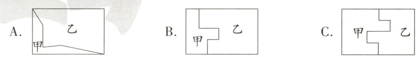 14. 三个同样大小的长方形被分成甲、乙两部分,符合“甲的周长<乙的周长,甲的面积<乙的面积”条件的是( )。