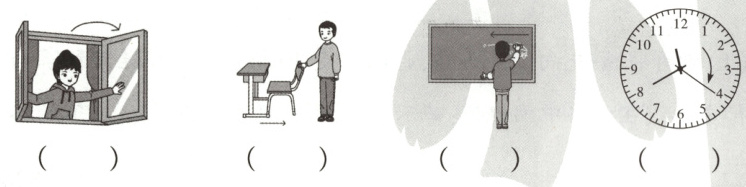 ○ △ △ ○ [解析]推拉窗户时窗户的运动属于旋转现象;拉凳子时凳子的运动属于平移现象;擦黑板时板擦的运动属于平移现象;钟表指针的运动属于旋转现象。