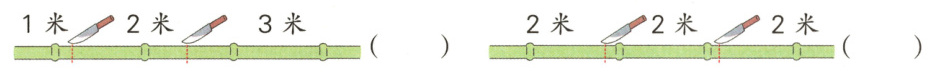 1. 果场叔叔要用一根6米长的竹子截成三段围成一个三角形框架,以下两种截法中,可以围成的画“√”,不可以的画“×”。