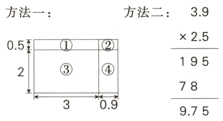 5. [新趋势·算理探究]计算$3.9×2.5$时,小林用了下面两种方法。
