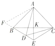 以A为顶点,AE为一边作∠EAF = 60°,AF交DB的延长线于点F,设AE交BC于K,如图,