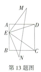 13.(2024北京师大附中一模,16,★★☆)如图,正方形ABCD的边长为2,点E是边AB上的动点,连接ED、EC,将ED绕点E顺时针旋转90°得到EN,将EC绕点E逆时针旋转90°得到EM,连接MN,则线段MN的取值范围为_______.