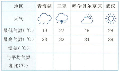 (2)你认识右表中的天气符号吗?青海湖的天气是( ),不适宜出行。呼伦贝尔草原的天气是( )。根据以往经验,三亚的夏天经常会有 天气, 表示( )。武汉是( )天。