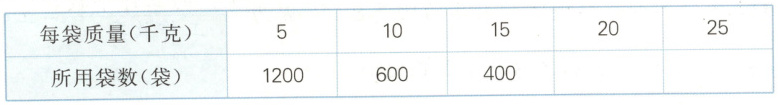解析:本题可根据每袋质量与所用袋数的乘积一定,先求出这批面粉的总质量,再用总质量分别除以$20$和$25$,即可求出对应的袋数。因为$5\times1200 = 6000$(千克),所以$6000\div20 = 300$(袋),$6000\div25 = 240$(袋)。