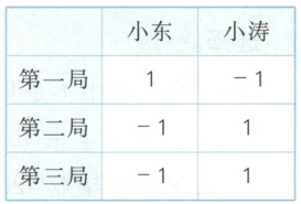 2. 小东和小涛进行象棋比赛,采取"五局三胜制"。比赛的规则是胜一局记1分,平一局记0分,输一局记-1分。现在赛了3局,成绩如右表所示: