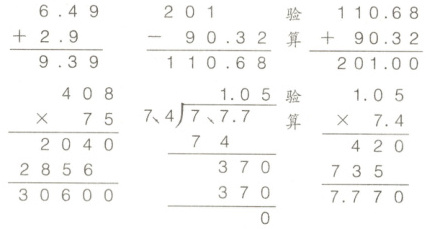 $6.49 + 2.9 =$ ※$201 - 90.32 =$ $408\times75 =$ ※$7.77\div7.4 =$