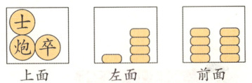 3. 桌子上面有一些叠起来的棋子,从上面、左面和前面观察这些棋子,看到的形状如下图所示。一共有多少颗棋子?