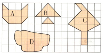 3. 图形A、B、C的面积分别是多少?图形D的面积大约是多少?(每小格面积表示1平方厘米)