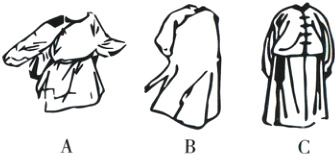 (2)由图可知,A是短衣,B是长袍,C是马褂。根据课文中对闰土的描写可知,闰土生活艰难,所以第一幅图带补丁的短式上衣更能够体现出闰土的身份特点。