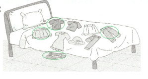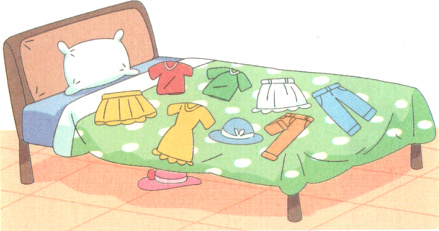 Hello, I'm Amy. I'm in Beijing now. The summer camp(夏令营) is over. It's time to pack my clothes. This is my red T - shirt. That is my yellow skirt. These are my blue pants. And those are my shoes. Wait! Is this my hat? No, it's Sarah's. Where's my hat? Oh, it's under the bed.