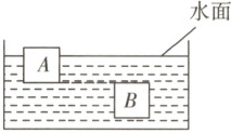 11. 两个体积相同的实心正方体A和B,静止在水槽内如图所示位置. 正方体A有$\frac{4}{5}$的体积浸入水中,正方体A的下表面和正方体B的上表面所处的深度相同. 设两正方体密度分别为ρA和ρB,所受浮力分别为FA和FB,所受重力分别为GA和GB,下表面所受水的压强分别为pA和pB,下列说法中( )