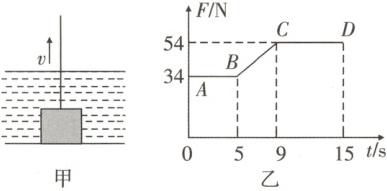 8. 如图甲所示,一个实心圆柱体金属块在细绳竖直向上的拉力的作用下,从水下一定深度开始竖直向上以0.1 m/s的速度做匀速直线运动,上升到离水面一定的高度处(假设水面不动). 如图乙所示是绳子的拉力F随时间t变化的图像,结合图像中的信息,下列判断正确的是(g取10 N/kg) ( )