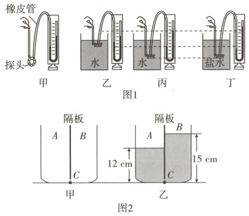 (5)利用如图2甲的实验器材进行拓展实验:容器中间用隔板分成$A$、$B$两部分,隔板底部有一小圆孔(用$C$表示),用薄橡皮膜封闭,橡皮膜两侧压强不同时,其形状会发生改变.如图2乙,当在$A$中盛水,测得深度为$12\ cm$,在$B$中盛某种液体,测得深度为$15\ cm$,此时$C$处橡皮膜形状刚好不改变,则$B$中液体密度$\rho_{液}=$_______$kg/m^{3}$.
