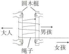 4. 大人、男孩、女孩用两根相同圆木棍和一根绳子玩“比力气”的游戏. 该游戏装置与滑轮组类似,如图是其示意图. 绳的一端固定在一根木棍上,在两根木棍上绕几圈后女孩捆住绳的另一端向外拉,大人、男孩则各握住一根木棍向外拉,三人中被拉动者为负,他们都使出了最大力气,仍处于“僵持”状态,没能分出胜负. 忽略绳与木棍之间的摩擦,以下做法中最有可能使女孩获胜的是 ( )