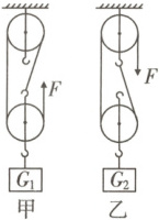 9.(枣庄期末)如图所示,每个滑轮的重力相等,不计绳重和摩擦,G1 = 60 N,G2 = 38 N,甲、乙两种情况下绳子在相等拉力F作用下静止. 则每个动滑轮的重力为 ( )