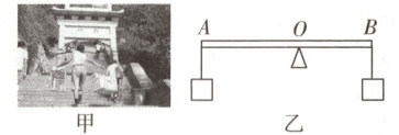 16. 如图甲所示,一位泰山挑山工用一根长1.8 m的扁担挑起货物,如图乙为扁担示意图,若在扁担的A端挂200 N的物体,B端挂300 N的物体,挑起重物时使扁担水平平衡,则挑山工肩膀需顶在距A端________ m远的位置(不计扁担的重力);挑山工工作时戴麻线手套,是为了________(选填“增大”或“减小”)手与扁担间的摩擦.