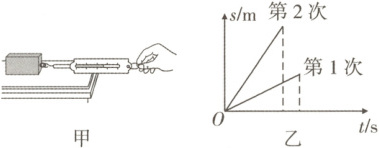 A [解析]由图乙可知,木块两次都做匀速直线运动,同一木块放在同一水平面上,压力不变、接触面的粗糙程度不变,所以两次木块受到的滑动摩擦力相等,则两次对应的弹簧测力计示数相等,即$F_{1}=F_{2}$;由图乙可知,相同时间内第1次木块运动的距离较小,由$W = Fs$可知,第1次拉力所做的功较少,即$W_{1}<W_{2}$. 故选A.