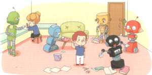 Welcome to the robot museum(博物馆)! Look! This robot has four arms. It's doing the housework now. The robot with four legs can help children learn. It's so nice! There is a pink robot over there. It has four eyes. Now, it is making a cake!