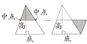 2. 新角度 创新题 慧慧学习了三角形的面积知识后,尝试用一个三角形推导三角形的面积公式。如图,慧慧先找到两条边的中点并连线,然后沿着这条线剪开,最后旋转阴影部分,拼成一个平行四边形。观察原来的三角形和转化后的平行四边形,写出它们之间的等量关系和公式推导过程。(5分)