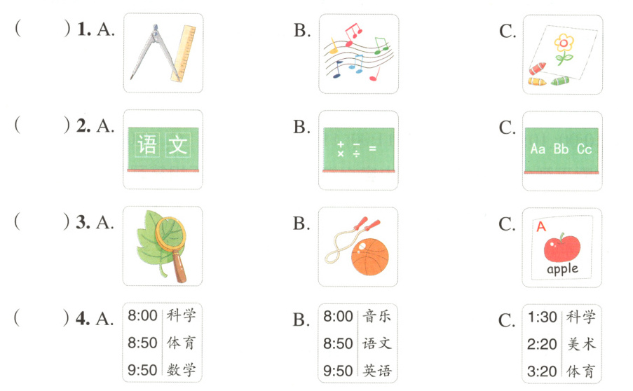 ( ) 1. A. I like Music and PE. B. I have Art and PE. C. He likes English and PE.