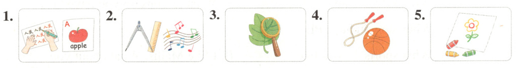 We have seven 1. ____________ today. In the morning, we have 2. ____________, Science, English and 3. ____________. I like them. 4. ____________ 11:30 a.m. to 2:00 p.m., we have a 5. ____________. We have 6. ____________, Music and PE in the afternoon. In the PE class, we can play ball games and run in the playground.