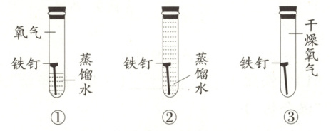 B 提示:试管②中只有水没有氧气,不生锈,试管③中只有氧气没有水,也不生锈,没有控制变量,对比②③无法证明铁钉生锈需要有水,故B项错误。