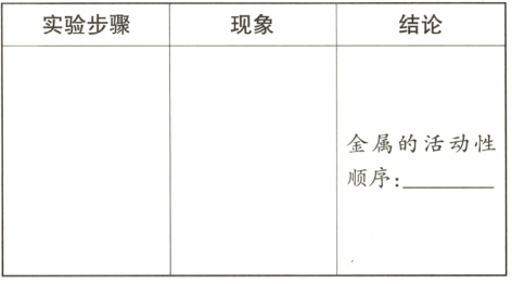 (3)将一块铁片放入盛有硫酸铜溶液的试管中,将铜片放入盛有硝酸银溶液的试管中,一段时间后观察现象。铁片表面析出一层紫红色固体,溶液由蓝色逐渐变为浅绿色;铜片表面析出一层银白色固体,溶液由无色逐渐变为蓝色。Fe>Cu>Ag(或铁>铜>银)