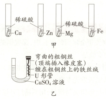 (3)4种金属的活动性顺序由强到弱为Mg>Zn>Fe>Cu,所以实验甲中,镁与酸反应最快;