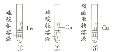 D 提示:实验①中,铁能和硫酸铜反应生成硫酸亚铁和铜,铁表面有紫红色固体析出,溶液颜色由蓝色逐渐变为浅绿色,故A项错误;实验③中,铜不能和硫酸亚铁反应,溶液颜色不变,故B项错误;①实验说明铁比铜活泼;②实验说明铜比银活泼;③实验说明铁比铜活泼,但不能得到金属铁和氢的活动性强弱,故C项错误